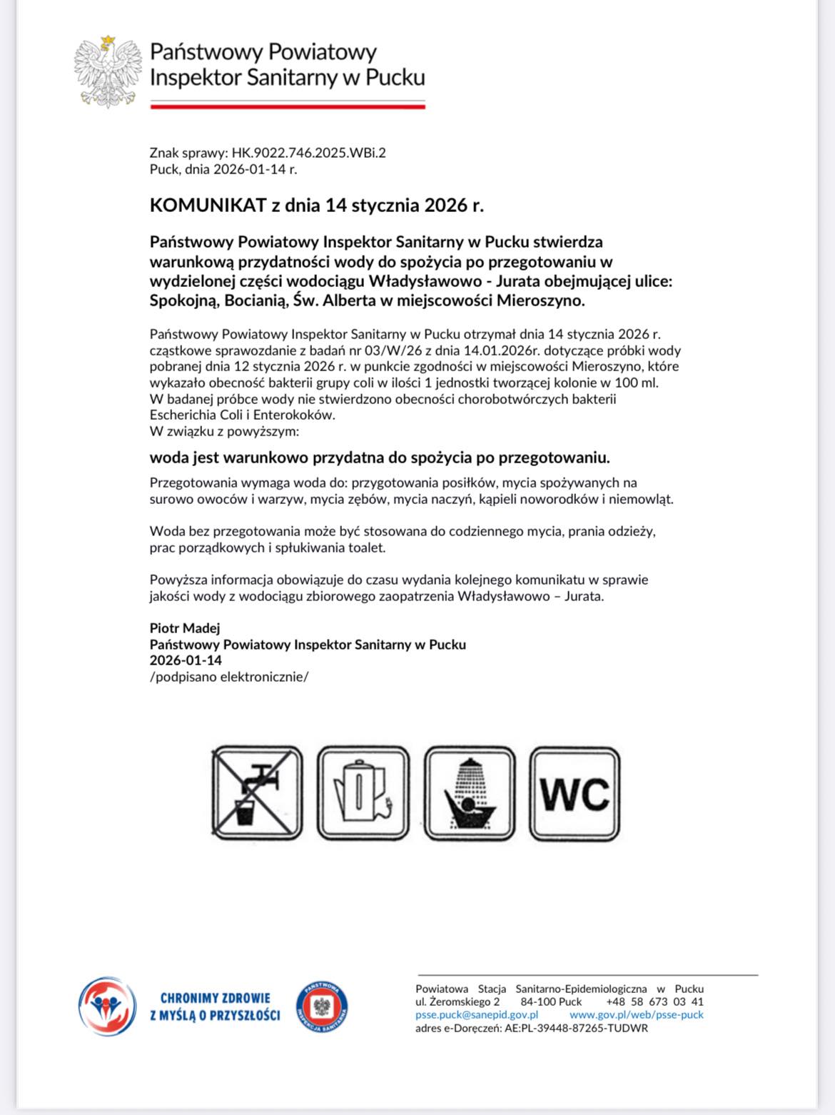 Ważna informacja dotycząca przydatności wody do spożycia – dla mieszkańców ul. Spokojnej, Bocianiej i Św. Alberta w Mieroszynie!