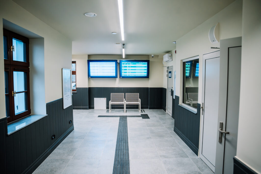 Wewnątrz budynku dworcowego powstała mała poczekalnia oraz toalety, podłogi wyłożone są dużymi płytami gresowymi przypominającymi lastriko, ściany do wysokości lamperii z wzorem imitującym sztukaterię, a w suficie zainstalowano oprawy liniowe. Stolarka okien i drzwi została odtworzona na wzór pierwotnej. Poczekalnię wyposażono w ławki, elektroniczne tablice odjazdów/przyjazdów, gabloty z rozkładami jazdy i zegar.