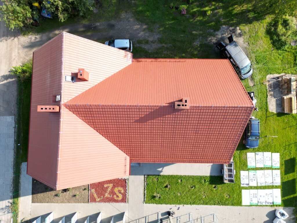 - wymianę pokrycia dachowego z blachy modułowej w kolorze ceglastym,
